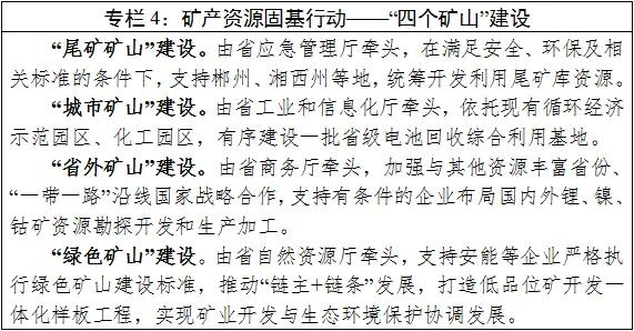 統(tǒng)籌開(kāi)展鋰電池及先進(jìn)儲(chǔ)能材料產(chǎn)業(yè)所需鋰、錳、鎳等主要礦產(chǎn)資源調(diào)查評(píng)價(jià)及勘查,加強(qiáng)新能源礦產(chǎn)資源儲(chǔ)備和統(tǒng)籌開(kāi)發(fā)利用。建設(shè)“尾礦礦山”,在滿(mǎn)足安全、環(huán)保及相關(guān)標(biāo)準(zhǔn)的條件下,支持開(kāi)發(fā)利用尾礦庫(kù)資源。建設(shè)“城市礦山”,依托現(xiàn)有循環(huán)經(jīng)濟(jì)示范園區(qū)、省級(jí)化工園區(qū),有序建設(shè)一批電池回收綜合利用示范基地。加強(qiáng)與其他資源豐富省份戰(zhàn)略合作,支持有條件的企業(yè)布局建設(shè)“省外礦山”,提升資源供應(yīng)保障能力。