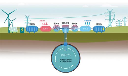 用電低谷時(shí),富余的電能驅(qū)動(dòng)壓縮機(jī),將空氣壓縮成高壓狀態(tài)。壓縮機(jī),類似自行車打氣筒,可將空氣打進(jìn)“輪胎”里,這個(gè)“輪胎”就是鹽穴、人工硐室等密封儲(chǔ)氣庫。壓縮空氣過程中產(chǎn)生的熱量,則以熱水、熔鹽等形態(tài)儲(chǔ)存在地面的儲(chǔ)熱罐中。