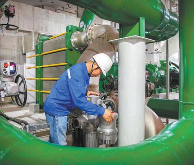 工作人員在壓縮空氣儲(chǔ)能電站調(diào)試壓縮機(jī)閉式冷卻水系統(tǒng)閥門。 丁小偉攝