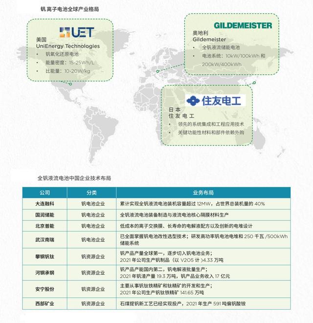 2022 年全釩液流電池整個(gè)行業(yè)還處于商業(yè)化進(jìn)程緩慢階段,全球范圍內(nèi)只有日本住友電工、美國 UniEnergyTechnologies、奧地利 Gildemeister 和中國大連融科能提供成熟的商業(yè)化產(chǎn)品。2023年,隨著我國在長時(shí)儲(chǔ)能、價(jià)格補(bǔ)償、鼓勵(lì)釩資源開發(fā)等支持政策的落地生效以及資本市場(chǎng)的追捧,全釩液流電池賽道創(chuàng)新企業(yè)涌現(xiàn),推動(dòng)我國全釩液流儲(chǔ)能技術(shù)和產(chǎn)業(yè)發(fā)展向世界領(lǐng)先水平邁進(jìn)。