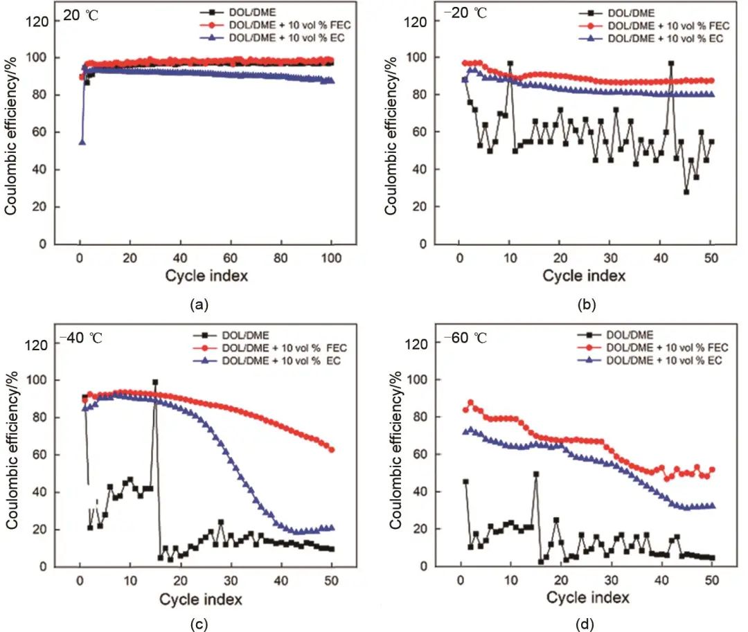 圖6 添加劑對鋰離子電池低溫循環(huán)性能的影響:使用含有不同添加劑的醚類電解液的Li/LFP電池在(a) 20 ℃、(b) -20 ℃、(c) -40 ℃和(d) -60 ℃下的循環(huán)性能