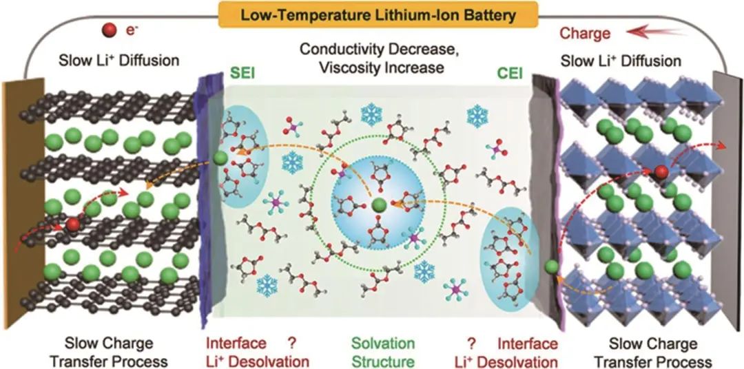 鋰電池低溫性能衰退的原因機理如圖2所示,主要是:①低溫下電解液的電導(dǎo)率下降,黏度上升,阻礙了Li+在電解液內(nèi)的遷移;②Li+在負極(例如石墨、硅、鋰金屬)或正極(例如LiNixMnyCo1-x-yO2)中的擴散系數(shù)在低溫下下降,導(dǎo)致從電極擴散到電解液內(nèi)的Li+減少;③低溫下電荷轉(zhuǎn)移過程更加困難,電荷轉(zhuǎn)移電阻(Rct)顯著提高,并且Li+在SEI和CEI內(nèi)的擴散系數(shù)下降。這三個原因分別從主體電解液中遷移、電極內(nèi)部擴散以及界面電荷轉(zhuǎn)移三個方面阻礙了鋰電池的正常運行,造成了電池極化效應(yīng)的增大,從而降低了電池的放電容量和循環(huán)性能。