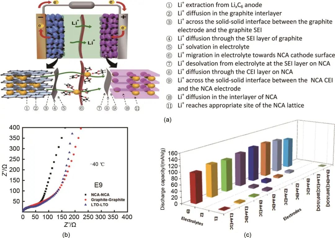 充電過程中石墨負極表面發(fā)生鋰沉積是造成LIBs在低溫下充電困難和循環(huán)性能衰減的重要原因,但是其并不是LIBs低溫放電容量衰退的主要原因,因為在相同條件下LIBs在低溫下可以順利地進行負極的鋰脫嵌(放電)。為了尋找低溫下鋰電池放電容量衰退的根本原因,Zhang等利用電化學(xué)阻抗譜(EIS)分析了低溫下LIBs的主體電阻(Rb)、SEI電阻(Rsei)以及電荷轉(zhuǎn)移電阻(Rct)的變化情況,實驗發(fā)現(xiàn)當溫度低于10 ℃時,LIBs的Rct顯著增加,而Rb和Rsei增大不明顯,由此證明低溫下電荷轉(zhuǎn)移過程中的Rct是影響電池性能的主導(dǎo),而由于低溫導(dǎo)致的電導(dǎo)率下降和黏度上升等造成的Rb上升并不是低溫性能衰退的最主要原因。電荷轉(zhuǎn)移電阻Rct的提高主要是因為低溫下鋰離子在充放電過程中發(fā)生電極反應(yīng)時的電荷轉(zhuǎn)移能壘阻礙變大。Li等將整個放電過程中鋰離子從負極遷移到正極的全部過程總結(jié)如圖4(a)所示,其中發(fā)生在電極和電解液主體的步驟①、②、⑩、 和⑥產(chǎn)生的電阻分別為Rb和Rsei,而在電極-電解液界面上發(fā)生的步驟③~⑤和⑦~⑨中產(chǎn)生的阻礙則體現(xiàn)在Rct中。文獻指出電荷轉(zhuǎn)移產(chǎn)生的Rct主要是由兩部分組成:①溶劑化后的鋰離子溶劑化鞘在接近電極時發(fā)生去溶劑化,鋰離子脫離溶劑化鞘形成“裸”離子;②去溶劑化后的鋰離子穿過電極表面SEI/CEI。研究者利用鈦酸鋰(LTO)正極特殊的嵌入電位不會形成SEI的特性,實現(xiàn)了去溶劑化和鋰離子穿過SEI/CEI過程的解耦,通過對比相同電解液下不同對稱電池在低溫下的EIS阻抗譜[圖4(b)],發(fā)現(xiàn)SEI/CEI的存在與否對Rct的影響很有限,說明了鋰離子插入正極或負極前的去溶劑化過程才是電荷轉(zhuǎn)移電阻Rct的主要貢獻者,尤其是在低溫下去溶劑化貢獻的電阻往往遠大于其他的電荷轉(zhuǎn)移步驟,不同去溶劑化性能的電解液的低溫性能如圖4(c)所示。