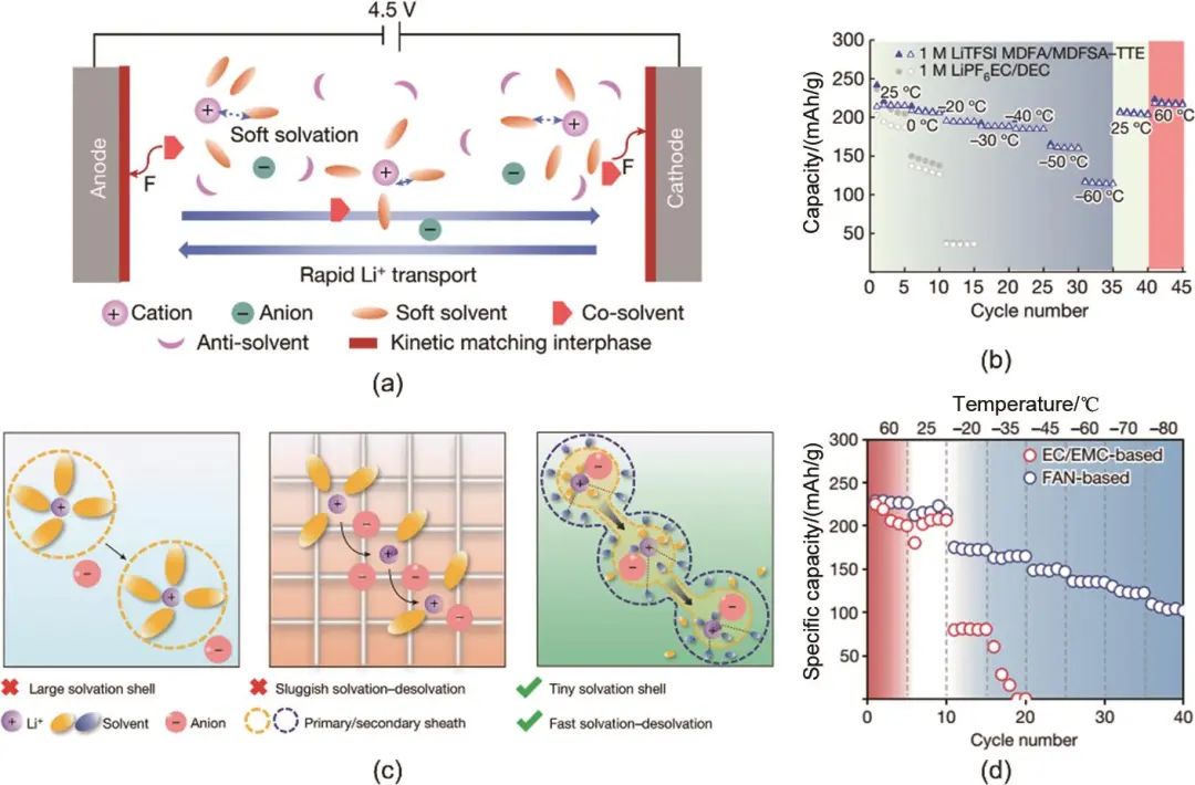 圖10 (a) “軟”溶劑化結(jié)構(gòu)的機理示意圖;(b) 不同溫度下使用“軟”溶劑電解液的石墨/NMC電池的循環(huán)性能;