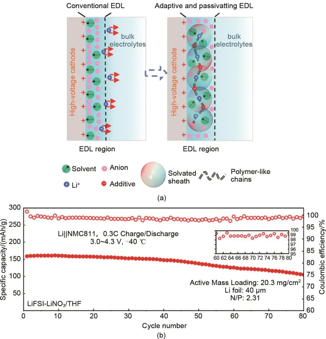 電池中的電極反應(yīng)都是在電極-電解質(zhì)界面發(fā)生的,調(diào)控鋰離子在電極-電解質(zhì)界面處的溶劑化結(jié)構(gòu)和電荷轉(zhuǎn)移行為,加快鋰離子在界面處的離子傳輸和去溶劑化過程,有助于電池實現(xiàn)在低溫下高效穩(wěn)定運行。Zhang等提出了一種加入“刺激響應(yīng)型”添加劑的在正極/電解液界面構(gòu)建了動態(tài)高穩(wěn)定雙電層的界面溶劑化結(jié)構(gòu)調(diào)控策略。作者篩選了一系列離子尺寸小且與鋰離子具有強結(jié)合能力的陰離子作為“刺激響應(yīng)型”添加劑(例如NO3-、ClO4-、Br-等),如圖11(a)所示,添加劑陰離子在電池充電時,可在電壓驅(qū)動下快速遷移到正極界面,添加劑陰離子與鋰離子間的強相互作用使得在正極界面雙電層中形成了特殊的“超分子動態(tài)網(wǎng)絡(luò)結(jié)構(gòu)”。在此動態(tài)網(wǎng)絡(luò)結(jié)構(gòu)中,添加劑吸引豐富的鋰離子,促進鋰離子在界面處的遷移和從主體電解液中脫去溶劑,并且雙電層處于“富鋰離子-貧電解液”狀態(tài),其內(nèi)部所有的溶劑分子都參與鋰離子溶劑化,降低了雙電層內(nèi)溶劑的HOMO能級,將不穩(wěn)定的“自由溶劑”排除出雙電層,顯著提升了正極界面上溶劑的氧化穩(wěn)定性。通過這樣巧妙的電極/電解液界面設(shè)計實現(xiàn)了本體醚基電解液和界面電解液的解耦,憑借本體電解液的高離子導(dǎo)電性和界面處快速的電荷轉(zhuǎn)移機制實現(xiàn)了優(yōu)異的低溫性能。相較于常規(guī)電解液在0 ℃以下迅速下降的低溫性能,添加劑輔助的醚類電解液實現(xiàn)了Li/NMC全電池在-40 ℃下的穩(wěn)定充放電循環(huán)[圖11(b)]。這種利用特殊界面化學(xué)來優(yōu)化電解液低溫性能的方式在后期被廣泛關(guān)注,研究人員進一步豐富了具有界面調(diào)控功能的添加劑類型并對吸附性添加劑在界面的作用機理進行了補充探究。