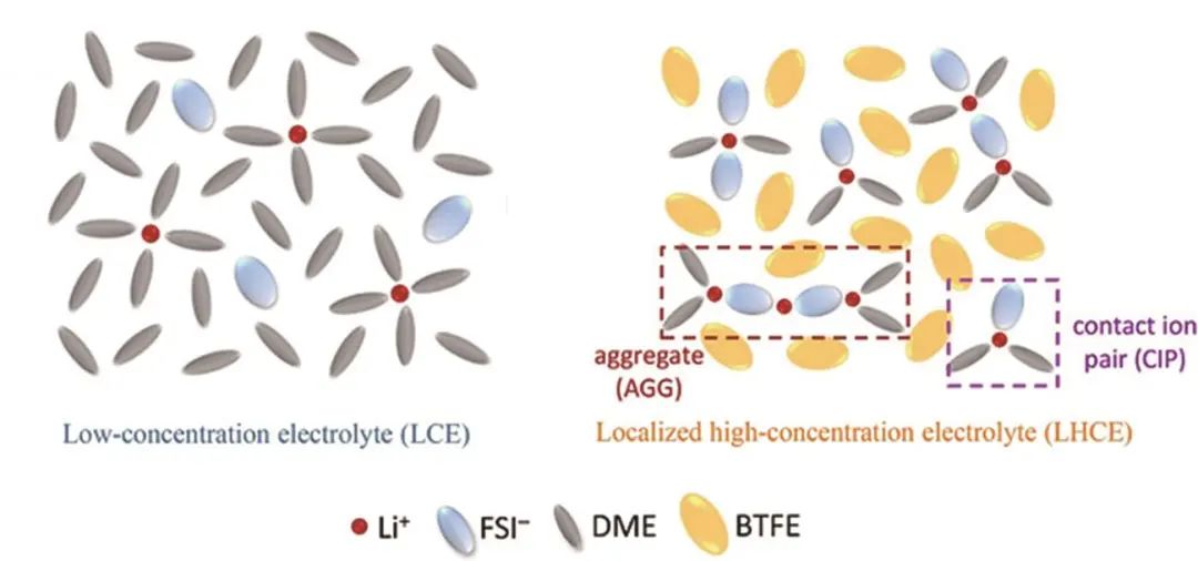 近些年來,高濃度電解液(HCEs)受到了廣泛的關(guān)注,通過提高電解液中的鋰鹽濃度,使得大量的鋰離子將全部溶劑完全配位,顯著提高溶劑的HOMO能級,提高電解液的電化學(xué)穩(wěn)定性。更重要的是當溶劑分子和鋰離子的摩爾比大于4時,溶劑分子不足以和大量的鋰離子完全配位,因此陰離子會“擠”進溶劑化鞘中,形成接觸離子對的CIP結(jié)構(gòu)和聚集離子對的AGG結(jié)構(gòu),這一存在陰離子的溶劑化結(jié)構(gòu)相較于原有的SSIP結(jié)構(gòu)擁有更低的去溶劑化能壘,并且參與溶劑化的陰離子表現(xiàn)出更低的LUMO能級,在形成SEI/CEI過程中,溶劑化結(jié)構(gòu)中的陰離子會優(yōu)先還原分解,形成含有更多陰離子衍生的無機組分的SEI,其擁有更好的電化學(xué)性能和機械穩(wěn)定性、更有利的鋰金屬兼容性,顯著提高鋰金屬負極的循環(huán)穩(wěn)定性。但是HCEs的黏度高、潤濕性差、電導(dǎo)率低等問題使得其在低溫下幾乎不能使用,并且由于超高的鋰鹽黏度,電池的能量密度顯著下降,成本也不可接受,這些都限制了HCEs的實際運用。為了解決HCEs的種種問題,研究人員提出使用非極性的低黏度稀釋劑來稀釋HCEs,非極性稀釋劑與鋰離子沒有相互作用,有效保留HCEs中特殊的CIP和AGG溶劑化結(jié)構(gòu)的同時,可降低鋰鹽濃度和電解質(zhì)的黏度,提高了整體電解液的電導(dǎo)率。如圖8所示,這種采用稀釋高濃電解液的方式得到的電解液被稱為局部高濃電解液(LHCEs),其保留了HCEs優(yōu)點的同時,極大地改進了HCEs的缺點,并且降低了成本,提高了整體的能量密度。