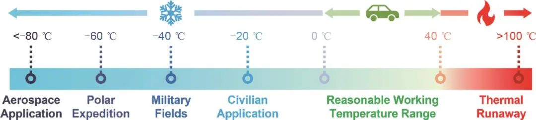 除了對能量密度的要求外,對鋰電池在特殊環(huán)境下的使用性能要求也越來越高。近年來,鋰電池在低溫環(huán)境下的性能受到了廣泛的關(guān)注。圖1展示了應(yīng)用于不同領(lǐng)域的鋰電池所需的有效工作溫度范圍,在寒冷的季節(jié)或嚴寒地區(qū),消費電子或電動汽車上的民用鋰電池需要適應(yīng)接近-20 ℃的低溫并要求進行穩(wěn)定的電池充放電,而使用在軍事或航空航天領(lǐng)域的電化學(xué)儲能系統(tǒng)的使用環(huán)境溫度甚至低于-60 ℃,但是目前普遍商業(yè)化使用的碳酸酯基電解液在-20 ℃時會發(fā)生電導(dǎo)率下降、黏度上升,甚至凝固等現(xiàn)象,引發(fā)電池嚴重的容量衰退、壽命減短和充電困難,這限制了現(xiàn)有鋰離子電池在低溫條件下的使用。因此如何抑制鋰電池在低溫下的容量衰退,提高其在低溫下的使用壽命和循環(huán)穩(wěn)定性,是鋰電池未來發(fā)展中的一個最重要的挑戰(zhàn)。