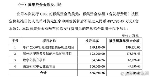 此次發(fā)行GDR的募集資金為美元,募集資金總額(含發(fā)行費用)折算后不超過人民幣48.78億元。所募資金在扣除發(fā)行費用后,將全部用于年產(chǎn)20GWh先進儲能裝備制造項目、海外逆變設(shè)備及儲能產(chǎn)品擴建項目、數(shù)字化提升項目以及南京研發(fā)中心建設(shè)項目。