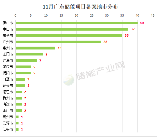 從各地市分布情況來(lái)看,儲(chǔ)能備案項(xiàng)目地市分布數(shù)量排名第一的佛山,為40個(gè);中山、東莞位列第二和第三,分別為37個(gè)和35個(gè)。前三名備案數(shù)量已經(jīng)占據(jù)廣東省57%以上。