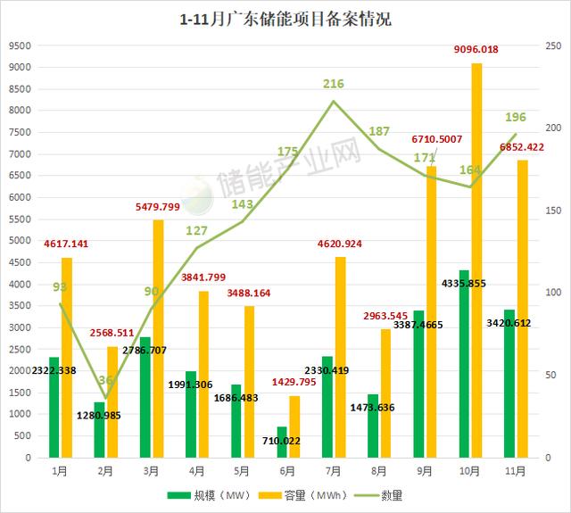 從1-11月廣東儲(chǔ)能項(xiàng)目備案情況來(lái)看,11月備案數(shù)量有196個(gè),相較于10月,數(shù)量上有所增加,但儲(chǔ)能項(xiàng)目備案規(guī)模出現(xiàn)下滑,合計(jì)為3420.612MW/6852.422MWh,規(guī)模下降的主要是因?yàn)榇笮蛢?chǔ)能電站項(xiàng)目的減少,大部分為用戶(hù)側(cè)工商業(yè)儲(chǔ)能項(xiàng)目。