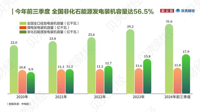 中國電力企業(yè)聯(lián)合會(huì)統(tǒng)計(jì)數(shù)據(jù)顯示,截至2024年9月底,全國全口徑發(fā)電裝機(jī)容量31.6億千瓦,煤電占總發(fā)電裝機(jī)容量的比重為37.3%,同比降低4.4個(gè)百分點(diǎn);非化石能源發(fā)電裝機(jī)容量17.9億千瓦,同比增長24.0%,占總裝機(jī)容量比重為56.5%,比上年同期提高4.5個(gè)百分點(diǎn)。這表明中國能源結(jié)構(gòu)持續(xù)優(yōu)化,清潔能源在總裝機(jī)中的重力提升,為實(shí)現(xiàn)“雙碳”目標(biāo)奠定了基礎(chǔ)。