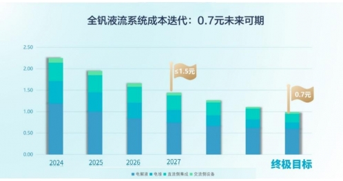 當(dāng)前國(guó)內(nèi)4小時(shí)全釩液流儲(chǔ)能系統(tǒng)成本仍保持在2元/Wh以上。據(jù)星辰新能測(cè)算,通過(guò)全產(chǎn)業(yè)鏈協(xié)同創(chuàng)新及規(guī)模效應(yīng)帶動(dòng),到2027年(中期目標(biāo))行業(yè)將邁入”1.5元時(shí)代”,2030年有望突破1元大關(guān)。隨著儲(chǔ)能時(shí)長(zhǎng)增加,功率成本將進(jìn)一步攤薄,最終實(shí)現(xiàn)0.7元/Wh的終極目標(biāo)。