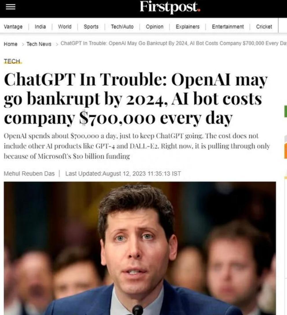2023 年 1 月,投資銀行摩根士丹利的一份分析報(bào)告稱,在 ChatGPT 上回復(fù)的成本約為谷歌搜索查詢平均成本的 6 倍至 28 倍。根據(jù)摩根士丹利最近的分析,谷歌去年 3.3 萬(wàn)億次搜索的平均成本約為每次 0.2 美分。因此可以看出,ChatGPT 聊天回復(fù)成本為 1.2 美分至 5.6 美分之間。根據(jù)公開的信息顯示,GPT4 一次完整的訓(xùn)練大約需要 6000 多萬(wàn)美元,報(bào)道所說(shuō)的 ChatGPT 每天耗費(fèi) 70 萬(wàn)美元,應(yīng)該主要是數(shù)據(jù)中心的日常算力消耗。僅在 2022 年 OpenAI 的財(cái)務(wù)凈虧損就高達(dá) 5.45 億美元。甚至有印度媒體聲稱 OpenAI 有在 2024 年倒閉的可能。