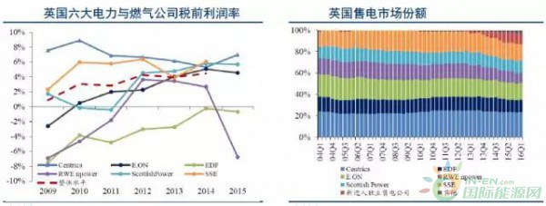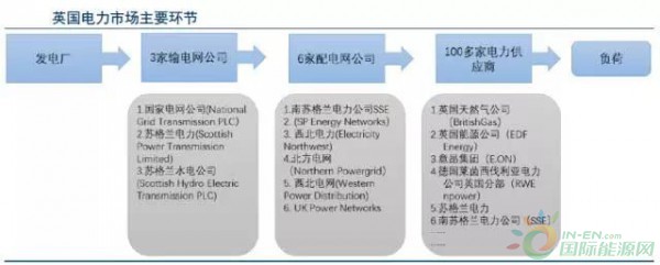 整個英國由3家輸電網(wǎng)公司負責區(qū)域性輸電網(wǎng)絡。在配電網(wǎng)層面,英國被劃分為14個區(qū)域并由6大配電網(wǎng)公司(DNOs)運營。配電公司作為獨立于輸電和售電環(huán)節(jié)的中間人,通過運作其擁有的配電網(wǎng)絡將輸電網(wǎng)傳輸?shù)碾娏Ψ峙浣o民用和工商業(yè)用戶。但是配電公司并不參與售電的環(huán)節(jié)。與發(fā)電、輸電和配電公司不同的是,英國電力供應商被定義為支付配電網(wǎng)絡費用并從電力批發(fā)市場中購買電力,再以一定價格出售給自己顧客的商業(yè)實體。