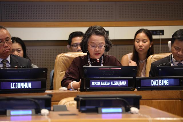 當?shù)貢r間7月13日,聯(lián)合國可持續(xù)發(fā)展高級別政治論壇能源主題邊會在紐約聯(lián)合國總部舉行,聯(lián)合國副秘書長兼聯(lián)合國亞洲及太平洋經(jīng)濟社會委員會執(zhí)行秘書阿米達·阿利斯夏巴納在會上講話。(合作組織供圖)