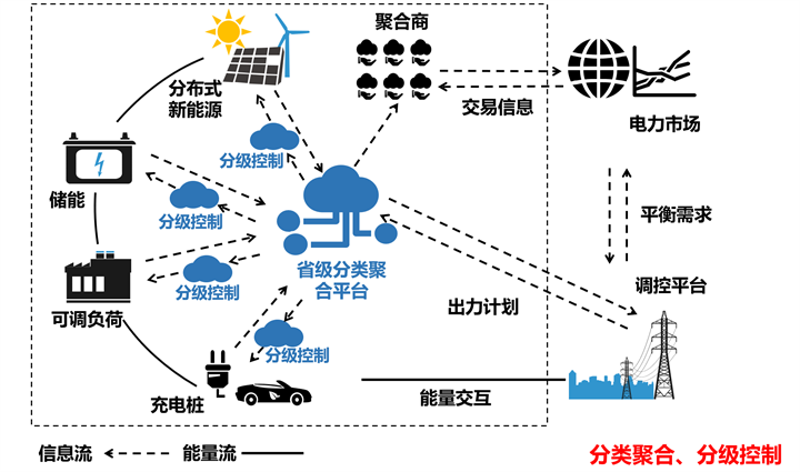 (十五)推動源網(wǎng)荷儲電力資源分類分級聚合?;诮y(tǒng)一的數(shù)字底座、物聯(lián)采集與實時量測中心等技術(shù)架構(gòu),建立和完善省級源網(wǎng)荷儲分類聚合平臺,通過統(tǒng)一平臺對源網(wǎng)荷儲四側(cè)資源分散聚合控制,實現(xiàn)電力系統(tǒng)分層分級的綜合動態(tài)平衡。開展源網(wǎng)荷儲分類分級聚合頂層設(shè)計,研究制定分類分級聚合的技術(shù)路徑和實施方案。推動分布式光伏運營監(jiān)測平臺、配電監(jiān)控系統(tǒng)的升級改造和分級應(yīng)用,實現(xiàn)對分布式光伏的“剛性控”“柔性控”“群調(diào)群控”等多場景靈活控制。完善常規(guī)中小電源聚合平臺,調(diào)動中小電源深度聚合的積極性,提升中小電源統(tǒng)一調(diào)度能力,實現(xiàn)廣域協(xié)同、靈活互動。深化建設(shè)新型負荷管理平臺,提升新型負荷管理系統(tǒng)智能化、實用化水平,對負荷資源分層分類統(tǒng)一管理、統(tǒng)一調(diào)控、統(tǒng)一服務(wù)。建設(shè)用戶側(cè)儲能監(jiān)控平臺,分級分類接入用戶側(cè)儲能電站數(shù)據(jù),實現(xiàn)海量用戶側(cè)儲能資源更大范圍的共享互濟和優(yōu)化配置。建立適應(yīng)源網(wǎng)荷儲分類分級聚合的調(diào)度模式和交易機制,貫穿省、市、縣三級調(diào)度系統(tǒng),制定并網(wǎng)管理、運行控制相關(guān)標(biāo)準(zhǔn)規(guī)范,完善清潔能源、需求側(cè)資源和儲能參與電力市場的機制,依托統(tǒng)一的信息共享和技術(shù)支持平臺,培育多類型聚合商參與分層分級聚合調(diào)度。構(gòu)建基于電網(wǎng)一張圖的新型電力系統(tǒng)全要素數(shù)字底座,開展新型電力系統(tǒng)各要素承載力的可視化推演計算,實現(xiàn)配網(wǎng)各環(huán)節(jié)、各業(yè)務(wù)以及新要素的全面圖上管控,提升分布式資源消納能力。
