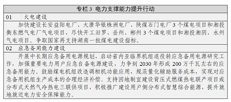 (八)提升電力應(yīng)急備用能力。加強極端形勢下電力風(fēng)險管控,做好應(yīng)對自然災(zāi)害、尖峰負荷、大面積停電、電網(wǎng)攻擊等情況的保供預(yù)案,提高應(yīng)急處置和抗災(zāi)能力。開展中長期應(yīng)急備用電源規(guī)劃,按照最大負荷3%—4%疊加新能源裝機容量1%—3%標(biāo)準(zhǔn)配置應(yīng)急備用電源規(guī)模。落實國家應(yīng)急備用電源管理要求,科學(xué)認(rèn)定和退出應(yīng)急備用機組,對符合能效、環(huán)保、安全等政策和標(biāo)準(zhǔn)要求的退役火電機組,按照“關(guān)而不拆”原則轉(zhuǎn)為應(yīng)急備用電源,做好設(shè)備維護和燃料供應(yīng)保障。支持分布式天然氣發(fā)電項目建設(shè),在有規(guī)模熱(冷)負荷的工業(yè)園區(qū)、經(jīng)濟開發(fā)區(qū)、空港新區(qū)等區(qū)域,因地制宜建設(shè)背壓式燃煤熱電聯(lián)產(chǎn)項目或分布式天然氣冷熱電三聯(lián)供項目,積極推廣建設(shè)用戶側(cè)分布式智慧綜合能源,提升就地就近電力安全保障能力。加強政府、醫(yī)院、鐵路、民航等重要電力用戶應(yīng)急自備電源建設(shè),力爭實現(xiàn)應(yīng)配盡配全面覆蓋,電源容量應(yīng)滿足全部保安負荷需求。加強抽水蓄能電站應(yīng)急備用能力建設(shè),推動抽水蓄能電站具備黑啟動功能。做好一次能源監(jiān)測預(yù)警和供應(yīng)協(xié)調(diào),提升電源發(fā)電能力,利用負荷和電源的時空互補特性,有效提高湖南與其他區(qū)域間電力互補互濟、調(diào)劑余缺能力。