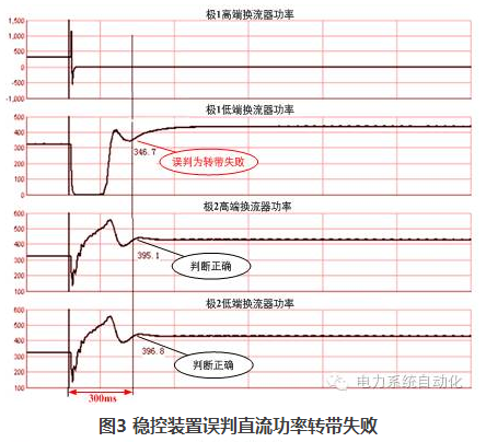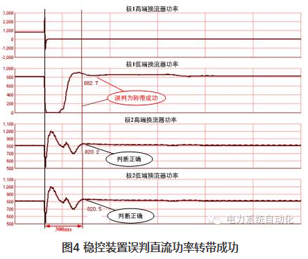 直流故障前后總損失的功率是穩(wěn)控系統執(zhí)行控制策略的重要依據。直流故障暫態(tài)過程復雜,若由穩(wěn)控裝置計算事故前功率與事故后的穩(wěn)態(tài)功率差,事故前后的時間窗口Δt難以確定。實踐表明:Δt過短(最初設計為30ms),可能會誤判健全換流器的轉帶;而延長Δt,即便是增加至300ms,在某些運行工況下,仍然會出現誤判為轉帶失?。ㄈ鐖D3)或誤判為轉帶成功(如圖4)的情況。經過大量實驗數據分析,若要確保在所有故障工況下裝置均不會誤判,則Δt至少需延長至500ms以上,無法滿足電網的穩(wěn)定控制需求。