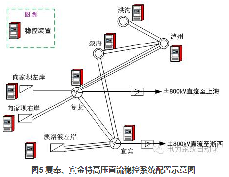 隨著多個特高壓交直流輸電通道的建成投產,控制策略的設計和制定面臨新的要求,尤其體現在多個穩(wěn)控系統和控制策略間的協調控制方面。以復奉直流、賓金直流為例,為了解決兩大特高壓直流送出的穩(wěn)定問題,在復龍換流站、宜賓換流站、溪洛渡電廠等8個廠站配置了安全穩(wěn)定控制裝置,如圖5所示。經計算,兩大直流故障后均可能會切除向左、向右以及溪左三個電廠的機組,兩個穩(wěn)控系統之間的控制措施有重疊。若按傳統的思路制定策略和實施方案,兩套穩(wěn)控系統間無信息交互和協調,當出現兩大直流同時雙極閉鎖的極端故障時,某些機組會同時被兩個主站發(fā)來的命令切除,從而導致控制措施量不足。