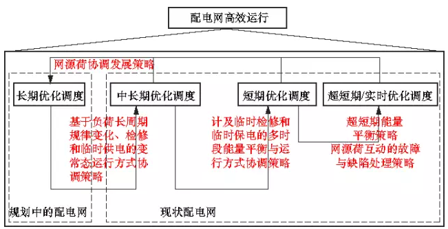 根據(jù)上述分析,本文提出了在時間尺度上形成“長期—中長期—短期—超短期/實時”的多時間尺度遞進式優(yōu)化調(diào)度策略,并以“局部平衡—分區(qū)協(xié)調(diào)—整體吸納”為原則,協(xié)調(diào)分布式電源、微電網(wǎng)、儲能裝置、可控負荷等調(diào)度對象,從而達到提高配電網(wǎng)供電可靠性與經(jīng)濟性,實現(xiàn)智能配電系統(tǒng)高效運行的目標。優(yōu)化調(diào)度模式層次結構如圖2所示。