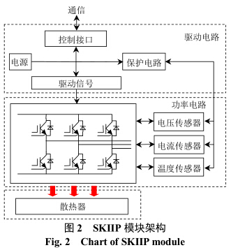 賽米控智能集成功率(Semikron integrated intel-ligent power,SKIIP)模塊[6]集成了功率半導(dǎo)體器件、散熱器以及具有保護和監(jiān)測電路的門極驅(qū)動電路,并具有用于短路和過電流保護的閉環(huán)電流傳感器,同時還集成了溫度傳感器。采用SKIIP模塊[6]可以大大簡化逆變器主電路,提高系統(tǒng)的抗干擾能力,該模塊具有標準接口,其架構(gòu)如圖2所示。