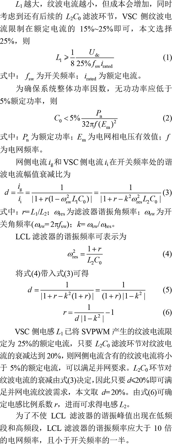 相對于傳統(tǒng)的單電感濾波器,3階LCL濾波器能更好地抑制并網(wǎng)變換器引起的電流諧波。LCL濾波器的參數(shù)對系統(tǒng)的動態(tài)及穩(wěn)態(tài)性能影響很大,文獻[7]對LCL濾波器參數(shù)的限制條件以及設(shè)計步驟做了詳細介紹,本文在此基礎(chǔ)上確定LCL濾波器的參數(shù)。根據(jù)VSC側(cè)電流最大允許紋波得到VSC側(cè)電感L1的最小值,根據(jù)系統(tǒng)的無功功率限定值求得濾波電容C0,最后根據(jù)并網(wǎng)電流總諧波得到網(wǎng)側(cè)電感L2。