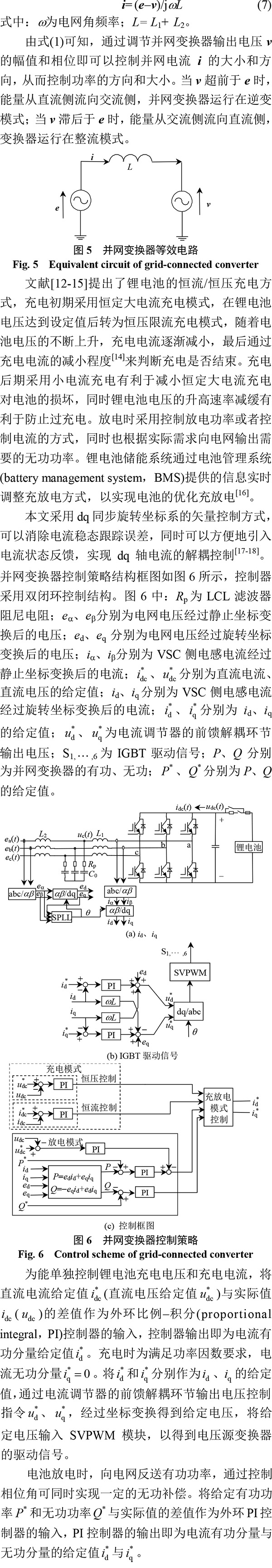 鋰電池儲能并網(wǎng)變換器的等效電路如圖5所示。并網(wǎng)變換器電壓v與電網(wǎng)電壓e控制的并網(wǎng)電流i之間的關(guān)系為