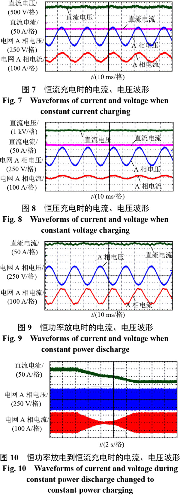 利用本文儲能并網(wǎng)變換器實現(xiàn)方案研制了試驗樣機,并進行了鋰電池儲能系統(tǒng)充放電測試,具體試驗內(nèi)容為恒流充電、恒壓充電、恒功率放電以及由充電到放電的過渡。
