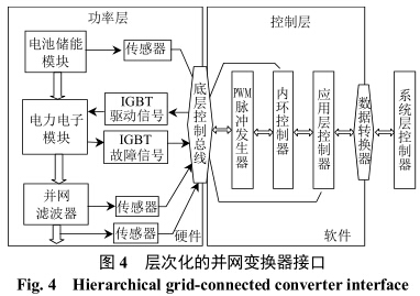 參照通信系統(tǒng)的開放系統(tǒng)互連(open system in-terconnection,OSI)模型,并網(wǎng)變換器分層控制功能示意圖如圖3所示。圖3中:θ為電網(wǎng)電壓相位;SPLL(software phase loop)為軟鎖相環(huán)[11];IGBT(insulated gate bipolar transistor)為絕緣柵雙極型晶體管。硬件層控制模塊由FPGA完成;應(yīng)用層控制模塊由DSP完成算法運算,提高了系統(tǒng)靈活性;系統(tǒng)層控制由上位機完成,可以實現(xiàn)多個儲能系統(tǒng)的大規(guī)模調(diào)度。層次化的并網(wǎng)變換器接口如圖4所示。