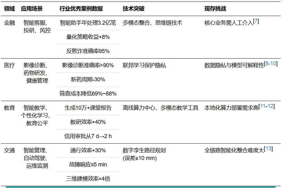 當前,AI大模型已在金融、醫(yī)療、教育、交通等領(lǐng)域?qū)崿F(xiàn)深度滲透,展現(xiàn)出顯著的產(chǎn)業(yè)價值與技術(shù)潛力。如表1所示,在金融領(lǐng)域,智能客服與風控系統(tǒng)的高效運作體現(xiàn)了多模態(tài)整合與思維鏈技術(shù)的成熟應(yīng)用,但核心決策仍依賴人工。醫(yī)療領(lǐng)域通過聯(lián)邦學習等技術(shù)突破,在影像診斷、藥物研發(fā)等方面取得成果,但數(shù)據(jù)隱私與模型可解釋性仍是關(guān)鍵瓶頸。教育領(lǐng)域依托離線算力中心與多模態(tài)工具,實現(xiàn)教學效率躍升,而本地化算力需求成為規(guī)?;瘧?yīng)用的制約因素。交通領(lǐng)域借助數(shù)字孿生技術(shù)顯著提升運維效率,但全鏈路智能化整合仍需突破。