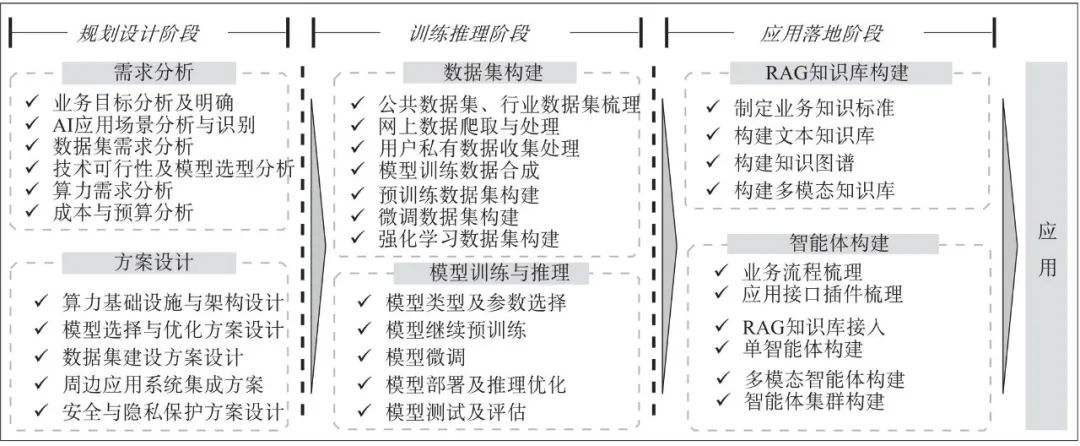 AI工程化整體流程涵蓋規(guī)劃設(shè)計、訓練推理和應(yīng)用落地三個階段(如圖1所示)。在規(guī)劃設(shè)計階段,首要關(guān)注企業(yè)戰(zhàn)略和業(yè)務(wù)目標選擇,圍繞全鏈路規(guī)劃展開需求分析,包括業(yè)務(wù)目標分析、AI應(yīng)用場景分析、數(shù)據(jù)需求分析、技術(shù)可行性及算力需求分析等。同時,基于AI原生(AI Native)的系統(tǒng)方案設(shè)計強調(diào)業(yè)務(wù)需求理解、數(shù)據(jù)治理、模型優(yōu)化與部署以及監(jiān)控與運維的重要性,遵循以AI為核心、數(shù)據(jù)優(yōu)先、持續(xù)學習與迭代、自適應(yīng)與個性化等設(shè)計原則。在訓練推理階段,針對通用AI大模型存在的“有幻覺、成本高”等問題,行業(yè)、領(lǐng)域AI大模型成為落地“人工智能+”的有效手段,企業(yè)需根據(jù)自身情況選擇開發(fā)L1行業(yè)模型或L2場景模型,并依托成熟工具平臺支撐數(shù)據(jù)集工程交付能力,同時注重模型體系設(shè)計與選擇、訓練及調(diào)優(yōu)以及推理優(yōu)化及評估等關(guān)鍵環(huán)節(jié)。在應(yīng)用落地階段,智能體應(yīng)用為AI大模型應(yīng)用落地提供技術(shù)化手段,通過構(gòu)建檢索增強生成(Retrieval-Augmented Generation,RAG)知識庫解決私域數(shù)據(jù)利用及實時性問題,同時智能體構(gòu)建的技術(shù)方法手段多樣,包括通過開發(fā)框架直接開發(fā)和基于智能體使能平臺構(gòu)建應(yīng)用,且智能體全生命周期可觀測體系和集群全生命周期管理體系為企業(yè)AI應(yīng)用的穩(wěn)定運行和持續(xù)優(yōu)化提供保障。