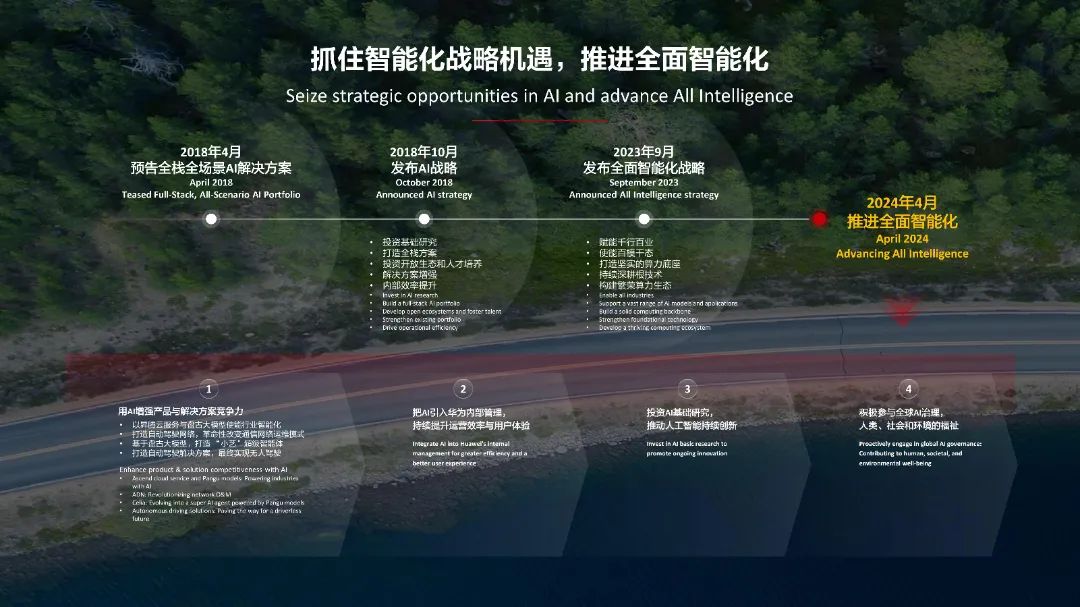 ? 第五個舉措,也是今天要重點闡述的,華為如何抓住智能化戰(zhàn)略機遇,推進全面智能化。華為公司的AI戰(zhàn)略以及全棧全場景AI解決方案是在2018年4月的分析師大會向大家預(yù)告的,并在2018年10月的全聯(lián)接大會正式發(fā)布的。在2023年9月的全聯(lián)接大會上,華為進一步發(fā)布了全面智能化的戰(zhàn)略,今天我將更具體地闡述華為如何來全面推進智能化。