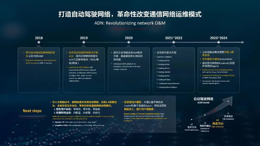 ? 打造自動駕駛網(wǎng)絡(luò),革命性改變通信網(wǎng)絡(luò)運維模式。電信運營商網(wǎng)絡(luò)運維是非常復(fù)雜的,因此成本也非常高。因此在2018年的日內(nèi)瓦UBBF,華為參考汽車自動駕駛的分級理念提出了自動駕駛網(wǎng)絡(luò)的概念,也就是ADN(Autonomous Driving Network)。經(jīng)過這么多年和電信運營商持續(xù)的探討、聯(lián)合創(chuàng)新,形成了大量的ADN解決方案,到今天,ADN已經(jīng)成為網(wǎng)絡(luò)運維智能化轉(zhuǎn)型的戰(zhàn)略共識。而大模型出來以后,自動駕駛網(wǎng)絡(luò)的目標更加具有現(xiàn)實意義了,運營商都希望自己的網(wǎng)絡(luò)能夠盡快實現(xiàn)自動駕駛、實現(xiàn)L4高度自治,未來實現(xiàn)完全自治,帶來以“零等待、零中斷、零接觸”為標志的極致的用戶體驗,和以“自配置、自修復(fù)、自優(yōu)化”為標志的極簡的網(wǎng)絡(luò)運維。華為將與中國及全球運營商合作打造通信大模型,并首先通過基于角色的Copilot和基于場景的Agent,幫助運營商賦能員工,提升用戶滿意度,讓運營商盡快因大模型技術(shù)和自動駕駛網(wǎng)絡(luò)而獲益。