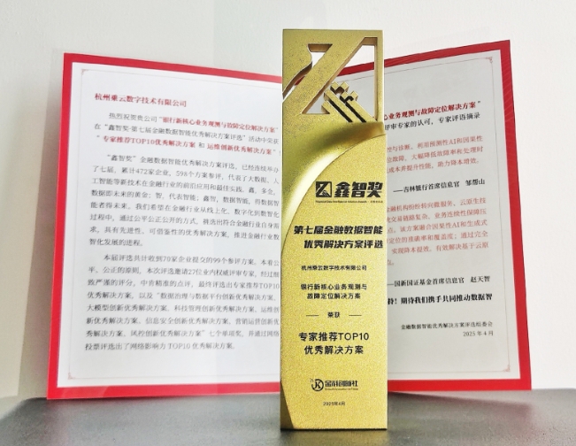 “鑫智獎(jiǎng)”作為金融數(shù)據(jù)智能領(lǐng)域的重要獎(jiǎng)項(xiàng),已連續(xù)舉辦七屆,致力于挖掘并推廣金融科技與數(shù)據(jù)智能深度融合的優(yōu)秀成果,彰顯數(shù)據(jù)智能在金融場(chǎng)景中的落地成效和未來潛力。2025年評(píng)選活動(dòng)共計(jì)收到來自70家企業(yè)的99個(gè)方案參評(píng),經(jīng)過27位專家評(píng)審與答辯打分,評(píng)選出專家推薦TOP10優(yōu)秀解決方案。乘云數(shù)字此次獲獎(jiǎng)的“專家推薦TOP10優(yōu)秀解決方案”,圍繞國(guó)內(nèi)銀行新一代核心系統(tǒng)的復(fù)雜性面臨的全新運(yùn)行穩(wěn)定性挑戰(zhàn),在快速的發(fā)現(xiàn)問題、定位問題、處理問題及大模型新技術(shù)的應(yīng)用等方面展現(xiàn)出專業(yè)、系統(tǒng)的技術(shù)優(yōu)勢(shì),獲得專家組高度認(rèn)可。
