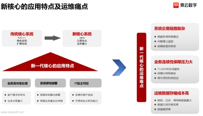 銀行新一代核心的復(fù)雜性帶來了全新的運(yùn)行穩(wěn)定性挑戰(zhàn),傳統(tǒng)監(jiān)控技術(shù)面臨嚴(yán)重瓶頸。DataBuff一體化觀測(cè)平臺(tái),通過創(chuàng)新的方式將“業(yè)務(wù)觀測(cè)”、“因果AI”、“生成式AI” 三大領(lǐng)先技術(shù)深度融合,幫助銀行全面解決新一代核心系統(tǒng)的運(yùn)行穩(wěn)定性問題。該平臺(tái)能夠深度感知新一代核心的業(yè)務(wù)運(yùn)行狀態(tài),全面梳理消費(fèi)者的業(yè)務(wù)旅程,構(gòu)建“以業(yè)務(wù)為中心”的新一代監(jiān)控管理體系,提供端到端的交易級(jí)鏈路追蹤能力,快速發(fā)現(xiàn)問題、定位問題、處理問題,實(shí)現(xiàn)故障定位的一鍵直達(dá)。