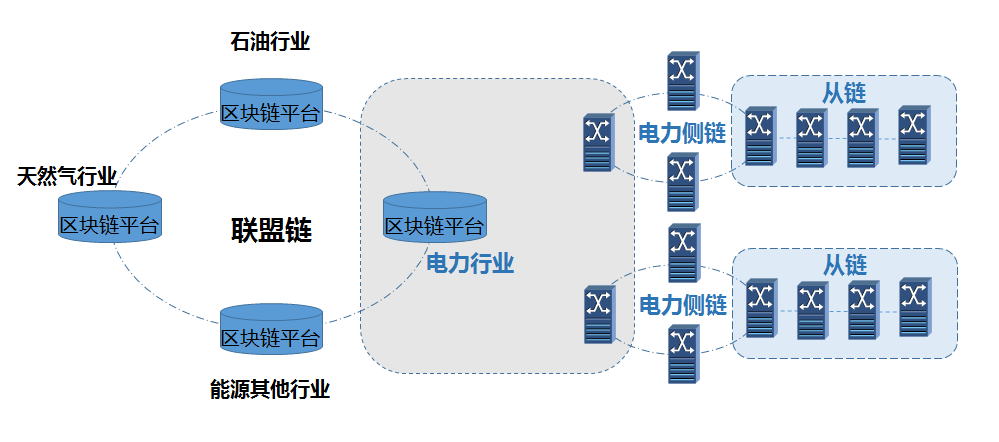 能源區(qū)塊鏈平臺(tái)以聯(lián)盟鏈架構(gòu)為基礎(chǔ),采用“主、側(cè)、從”多鏈混合模式(見圖1),構(gòu)建覆蓋電力、石油、天然氣等各類能源業(yè)務(wù)應(yīng)用的區(qū)塊鏈公共服務(wù)平臺(tái),為能源行業(yè)跨地域、跨企業(yè)的多方協(xié)同與信任傳導(dǎo)提供支撐。