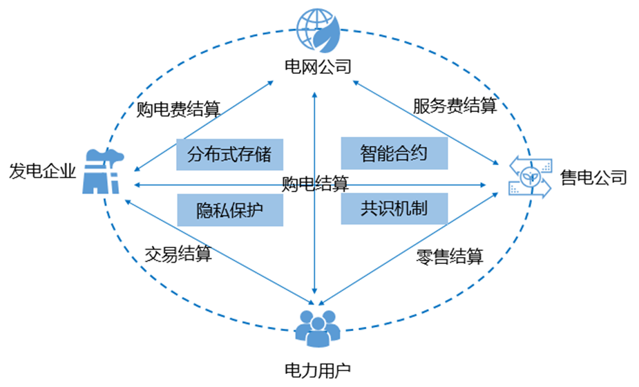 市場化的電費(fèi)結(jié)算是能源交易的核心業(yè)務(wù),我國的電費(fèi)結(jié)算技術(shù)開始于1960年,隨后被廣泛應(yīng)用于各行各業(yè)。目前,我國普遍采取“預(yù)購電”方式結(jié)算電費(fèi),但這種模式對(duì)分布式新能源接入等多種新場景,存在能量流、信息流不統(tǒng)一,交易流程長、響應(yīng)不及時(shí)、合同履約難掌控、信用體系難建立等問題。