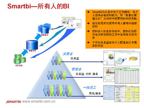數(shù)據(jù)應(yīng)用即為數(shù)據(jù)的應(yīng)用、交換與服務(wù),需要通過思邁特軟件Smartbi等可視化的途徑直接服務(wù)于企業(yè)的一線生產(chǎn)人員、監(jiān)管人員、業(yè)務(wù)負(fù)責(zé)人、公司高層以及企業(yè)董事。