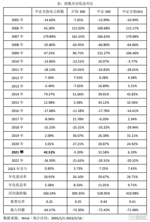 再來看過往收益率,據WIND統(tǒng)計顯示,自基日(2014年12月31日)以來,截至2023年2月16日,中證全指電力指數年化收益率約5.6%,整體表現落后于大盤基準(中證全指)。此外,該指數的年化波動率為26.9%,同樣低于部分大盤指數。不過自2021年起,由于電力市場化改革的加速,該指數取得了42.5%的收益,遠遠領先其他大盤指數。同時,其2022年的表現也領先大盤指數。