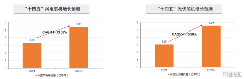 一方面,在“雙碳”目標下,新能源裝機量有望持續(xù)增長,尤其是風電、光伏領域。根據全球能源互聯(lián)網發(fā)展合作組織預測,到2025年,我國清潔能源裝機量將達到17億千瓦,其中風電裝機容量將達到5.36億千瓦,2021-2025年CAGR達13%;光伏裝機容量將達到5.59億千瓦,2021-2025年CAGR達16.26%。