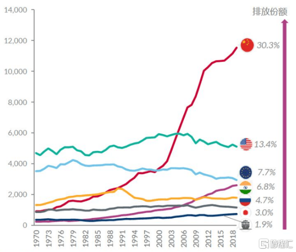 尤其是,中國、美國、歐盟等碳排放大國近幾年加快推進“碳中和”實現進程。根據公開數據顯示,2021年中國碳排放量占全球碳排放總量30.3%,美國占13.4%,歐盟占7.7%。