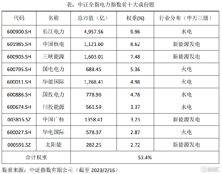 目前,中證全指電力指數(H30199.CSI)正是一個標準的電力行業(yè)指數---選取中證全指樣本股中的電力公用事業(yè)行業(yè)股票組成,以反映該行業(yè)股票的整體表現。據WIND統(tǒng)計顯示,截至2023年2月16日收盤計,全指電力指數共包含54只成份股,平均個股市值434.64億元。