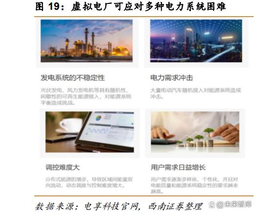 虛擬電廠具有需求側(cè)響應(yīng)、多負(fù)荷管理等多種功能,可應(yīng)對發(fā)電系統(tǒng)多樣化困難。虛擬 電廠可以應(yīng)對發(fā)電系統(tǒng)不穩(wěn)定性(風(fēng)光隨機(jī)性和間歇性對能源系統(tǒng)平衡造成挑戰(zhàn))、電力需 求沖擊(大量電動(dòng)汽車隨機(jī)接入,對能源系統(tǒng)造成沖擊)、調(diào)控難度大(分布式能源增多, 導(dǎo)致動(dòng)態(tài)調(diào)度與控制難度提升)和用戶需求日益提升等多種困難。
