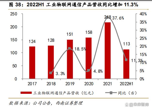 公司系工業(yè)物聯(lián)網(wǎng)龍頭,產(chǎn)品適用范圍廣。公司深耕工業(yè)物聯(lián)網(wǎng)二十年,在智能電力、 智能制造、智能零售、智慧城市等領(lǐng)域積累了諸多國內(nèi)外優(yōu)質(zhì)客戶,市場涵蓋中國、美國、 德國、英國等全球主要發(fā)達(dá)工業(yè)國家,良好的客戶資源為公司持續(xù)穩(wěn)定發(fā)展提供了有力保障。 工業(yè)物聯(lián)網(wǎng)通信產(chǎn)品可適用于各種工業(yè)領(lǐng)域,用于各種無人值守環(huán)境下工業(yè)設(shè)備的聯(lián)網(wǎng), 2021 年工業(yè)物聯(lián)網(wǎng)通信產(chǎn)品營收達(dá) 218 億元,同比高增 37.6%,2022H1 營收 113 億元, 同比增加 11.3%。