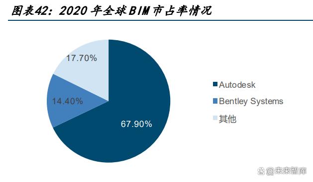 信創(chuàng)發(fā)展背景下,BIM 行業(yè)國產(chǎn)化替代需求強烈。信息技術應用創(chuàng)新為近年以來我國關鍵 命題,旨在通過對 IT 硬件、軟件的重構,建立我國自主可控的 IT 產(chǎn)業(yè)標準和生態(tài),逐步 實現(xiàn)各環(huán)節(jié)國產(chǎn)替代。國內使用的 BIM 平臺主要為國外軟件,而國內廠商主要以項目管理 和單點應用類型的產(chǎn)品為主,底層核心技術大多掌握在國外廠商手中。2020 年全球 BIM 行業(yè)市場中,Autodesk 市占率為 67.9%,其次 Bentley Systems 市占率為 14.37%,CR2 集中度較高,顯示出國產(chǎn)替代的必要性和緊迫性。