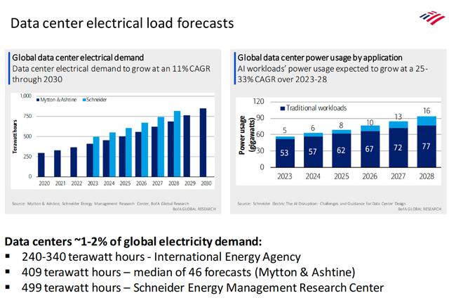 美銀美林預(yù)計(jì),到2030年,數(shù)據(jù)中心的電力需求預(yù)計(jì)將以11%的復(fù)合年增長(zhǎng)率增長(zhǎng)。這相當(dāng)于全球電力需求的約1-2%,即240-340太瓦時(shí)(1太瓦時(shí)等于10億千瓦時(shí))。