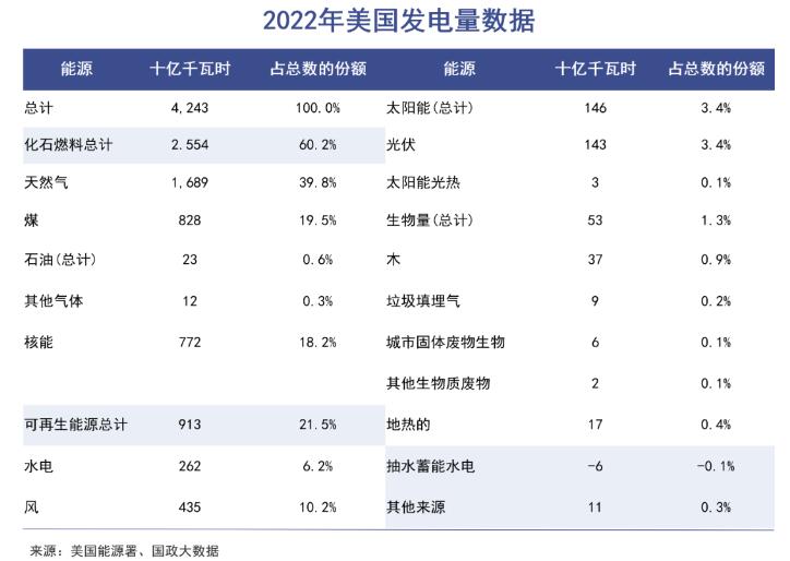 在《通脹削減法案》的刺激下,美國(guó)在新能源的道路上疾馳,煤電貢獻(xiàn)度明顯下降,風(fēng)光等可再生能源逐漸成為主力軍。2022年,美國(guó)煤電份額從23%減少到20%,核能從20%減少到18%。