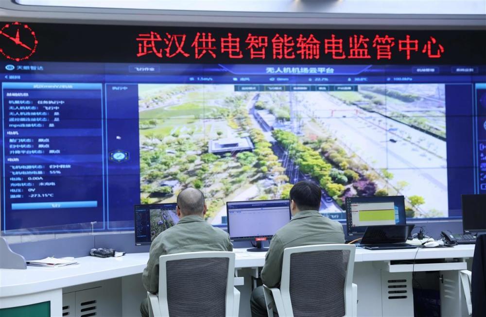 10月23日,武漢漢口江灘,一架白色的無人機在高空穿梭,機頭對準濱江區(qū)內(nèi)的國家電網(wǎng)線路來回進行掃描、拍攝。與此同時,距離巡檢現(xiàn)場數(shù)公里外的國網(wǎng)武漢供電公司的巨型屏幕上,無人機的超高清畫面即時顯示。