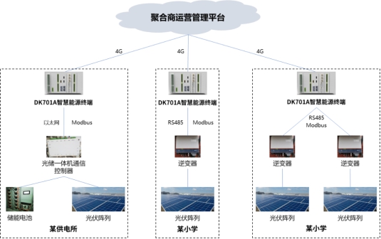 基于DK701智能終端平臺(tái)的優(yōu)勢特性,目前江行智能已成功開發(fā)DK701A智慧能源終端和DK701E儲(chǔ)能EMS就地控制器,并應(yīng)用到虛擬電廠聚合商運(yùn)營管理系統(tǒng)及數(shù)字配電網(wǎng)臺(tái)區(qū)儲(chǔ)能等項(xiàng)目建設(shè),在光伏、儲(chǔ)能、充電樁等具體場景發(fā)揮了重要作用。以國網(wǎng)寧夏某公司打造的聚合商運(yùn)營管理系統(tǒng)為例,通過在供電所、小學(xué)配置智慧能源終端,可將自身所擁有的分布式光伏、分布式儲(chǔ)能、電采暖等可調(diào)節(jié)資源數(shù)據(jù)接入省級虛擬電廠運(yùn)營管理平臺(tái),實(shí)現(xiàn)對可調(diào)節(jié)資源的可觀、可測、可調(diào)、可控。