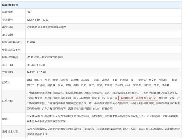 本網(wǎng)訊 2023年11月1日,中國(guó)信息協(xié)會(huì)發(fā)布《科學(xué)數(shù)據(jù)安全能力成熟度評(píng)估規(guī)范》團(tuán)體標(biāo)準(zhǔn),并于11月1日起開始實(shí)施。網(wǎng)御星云作為主筆單位深度參與標(biāo)準(zhǔn)的編制,牽頭標(biāo)準(zhǔn)起草、修訂等一系列工作。